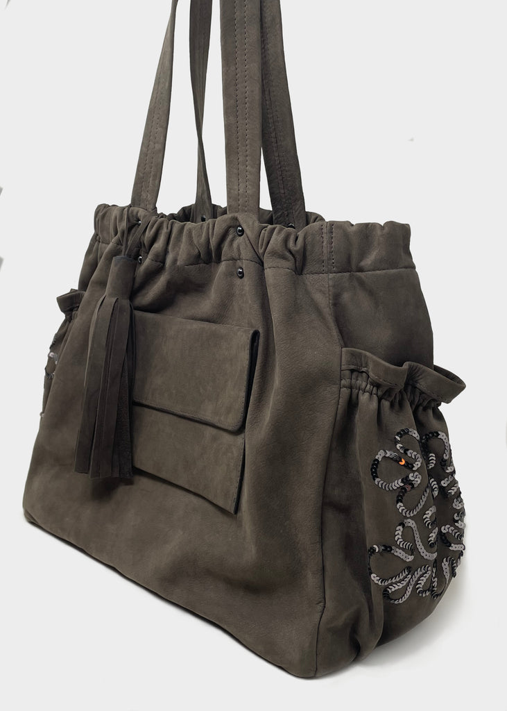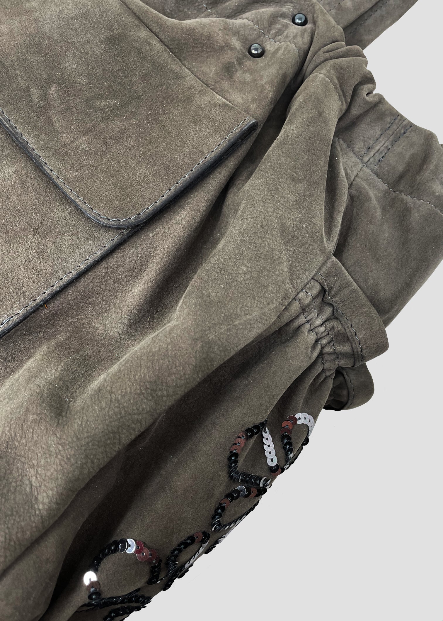 Sac en cuir velours porté à l’épauleMotif brodé de sequins et perles sur les pochesModèle unique Doublure en coton imprimé